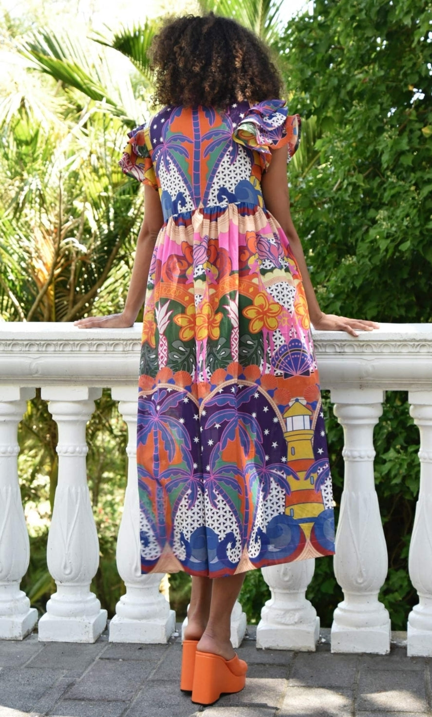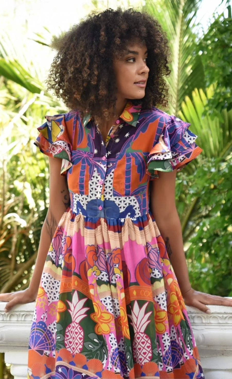 Bring the fun this spring in the ‘Flute Through’ dress, bursting with vibrant spring colours granted by the lightweight ‘Siesta Fiesta’ printed cotton. Sporting a ½ button front that falls into a gathered waistline and demure midi skirt, and layered ruffle sleeves, this dress will serve you your AM to PM plans with ease.