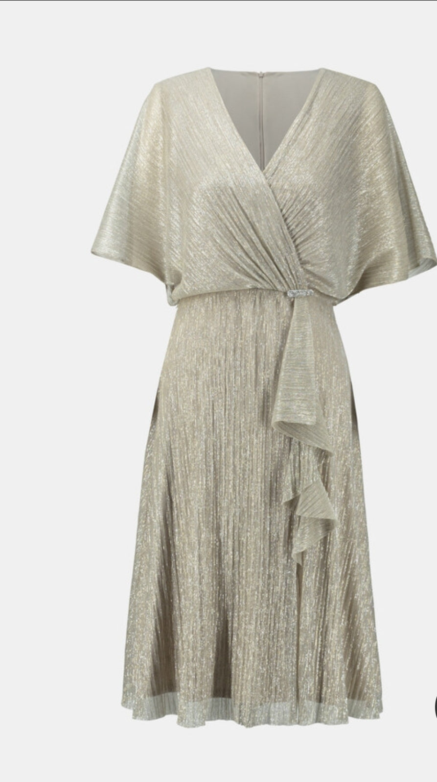 Step into sophistication with this knee-length wrap dress by Joseph Ribkoff. Designed for formal and nightout occasions, it features a flattering v-neckline, flutter sleeves, and a belted waist for a feminine silhouette. The ruffled details and slit add a touch of elegance, while the plain pattern ensures timeless charm. Perfect for making a lasting impression.