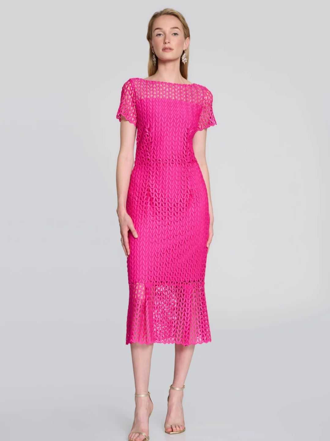 Embrace timeless elegance with the Phoebe Pink Guipure Lace Flounce Dress from our Joseph Ribkoff Collection. This exquisite dress showcases the delicate beauty of solid guipure lace, designed to envelop you in luxury and sophistication. The graceful boat neckline and refined scallop edge detailing at the sleeves and hem add a touch of classic charm, making this dress a perfect choice for any special occasion.